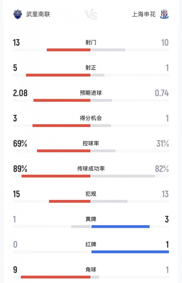 附武里南联2-0申花全场数据: