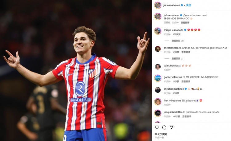 阿尔瓦雷斯也通过社媒晒出自己进球后的经典庆祝姿势,并配文道:“主场取得大胜!我们继续努力