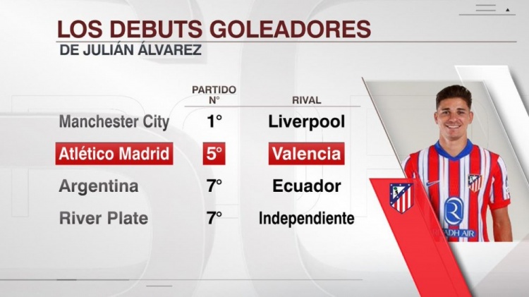 ESPN统计了阿尔瓦雷斯在俱乐部和国家队斩获首球所用的场次,他在曼城首秀就破门,而在马竞用了5场比赛收获首球。
