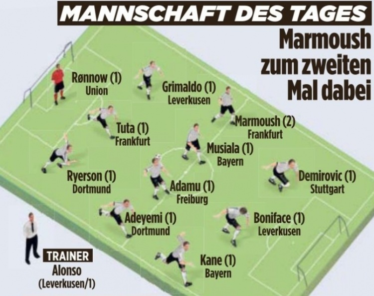 足坛汇9月16日讯 德甲本轮已经全部完赛,《图片报》也评出了本轮最佳阵容,拜仁、多特、药厂和法兰克福各2将在列。