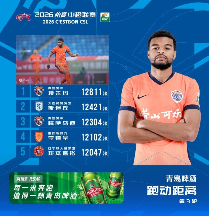 中超第三轮跑动榜:海牛外援埃朱马12811米居首,斯坦丘第二2026-03-23