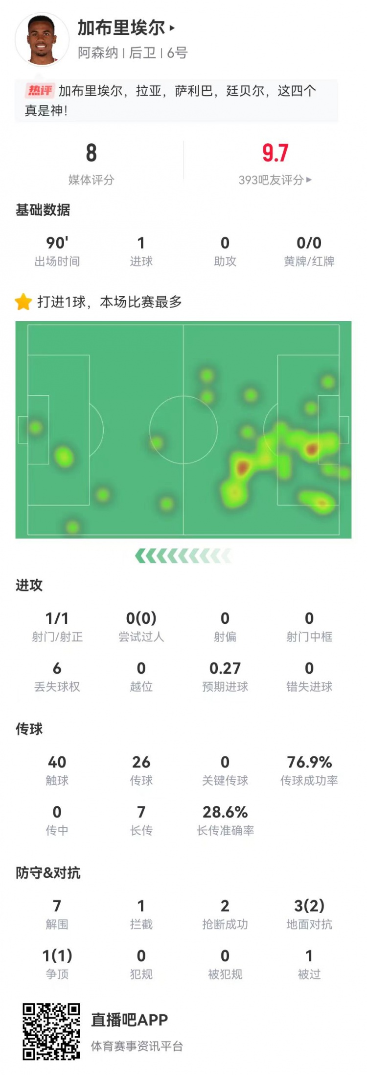 足坛汇9月15日讯 阿森纳在本轮英超焦点战1-0力克热刺,进球功臣加布里埃尔本场数据如下: