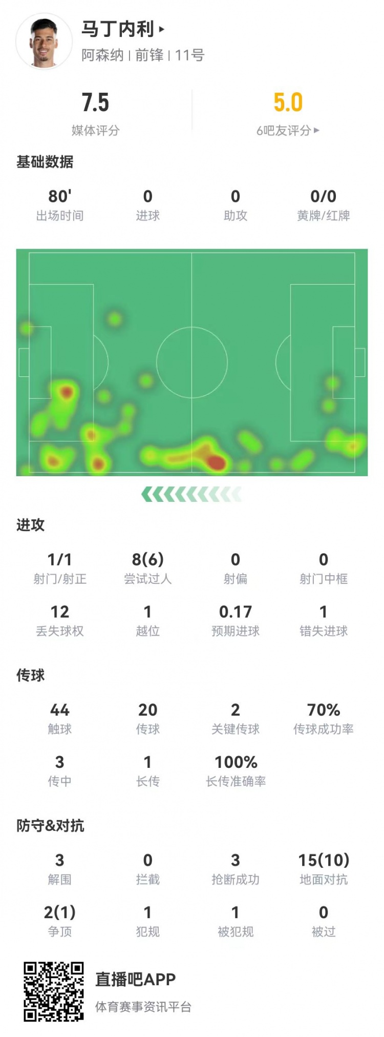 足坛汇9月15日讯 阿森纳在本轮英超客战热刺,马丁内利本场数据如下: