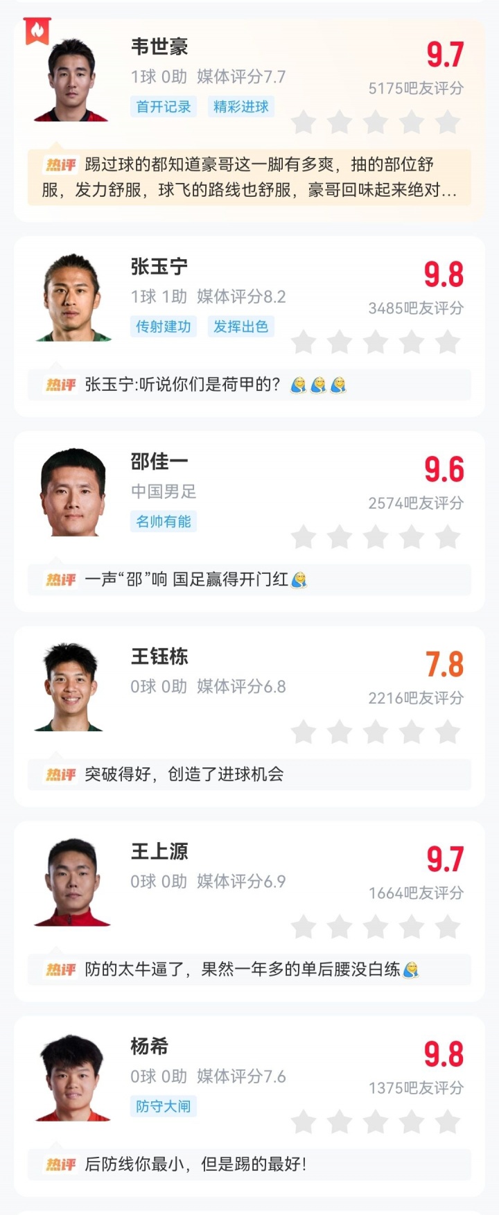 球员张玉宁、杨希9.8分全队最高,打入本场首球的韦世豪9.7分,