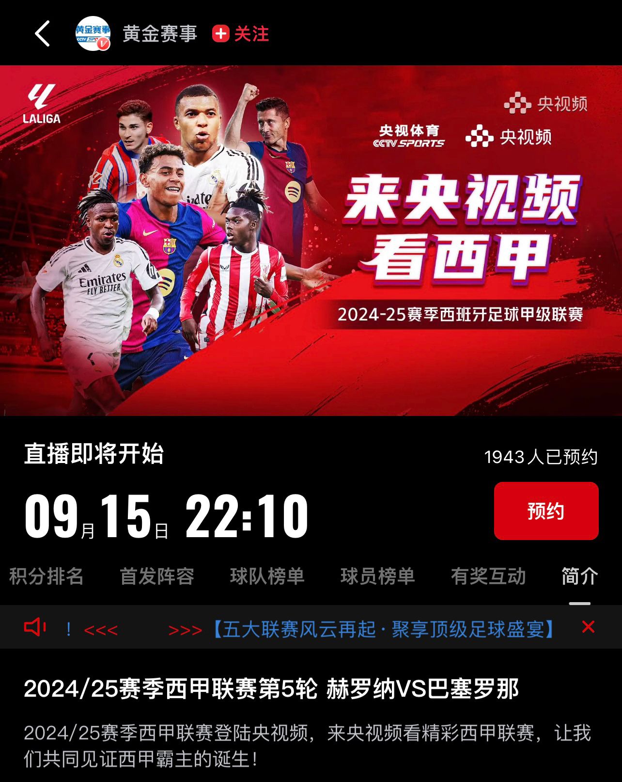 9月10日央视频透露,中央广播电视总台与西甲联盟签约,央视频将从本周末开始对2024-2025赛季西甲联赛进行现场直播。央视上一次转播西甲联赛还是在2014-15赛季。
