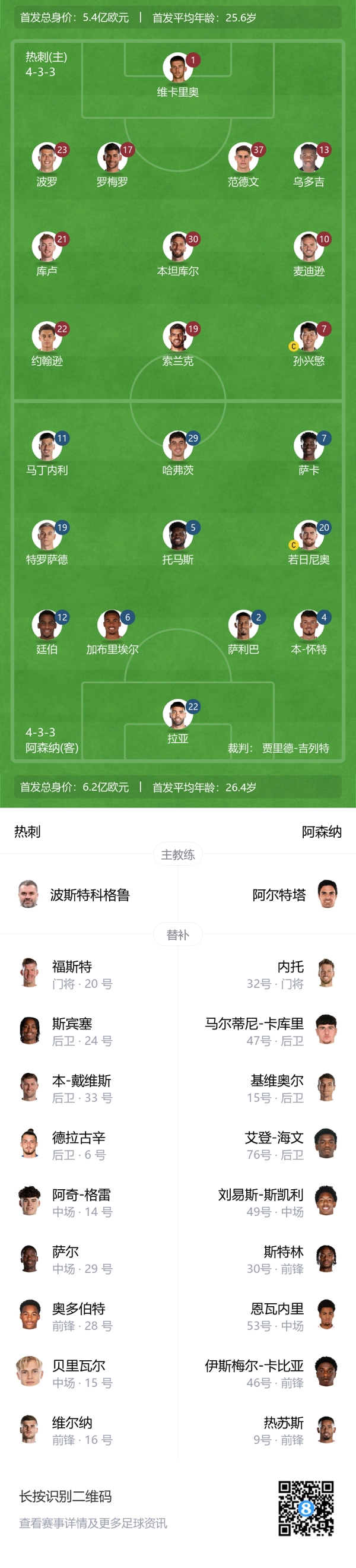 热刺替补:20-福斯特、24-斯宾塞、33-本-戴维斯、6-德拉古辛、14-阿奇-格雷、29-萨尔、15-贝里瓦尔、28-奥多贝尔、16-维尔纳