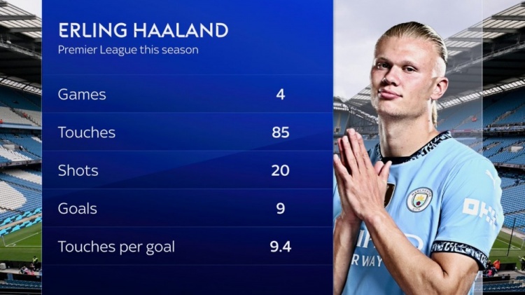 足坛汇9月15日讯 天空体育统计了哈兰德本赛季的英超数据,这位曼城前锋每9.4次触球打进1球。