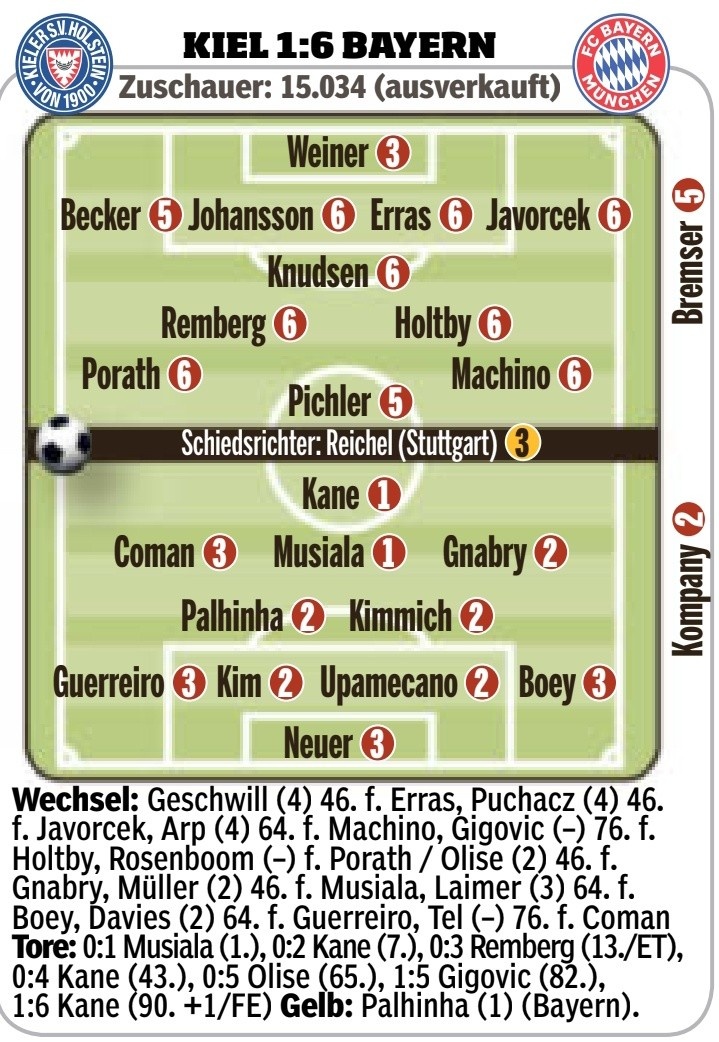 足坛汇9月15日讯 在德甲第3轮比赛中,拜仁客场6-1击败荷尔斯泰因基尔,《图片报》为两队教练和球员评分,凯恩、穆西亚拉1分最高。