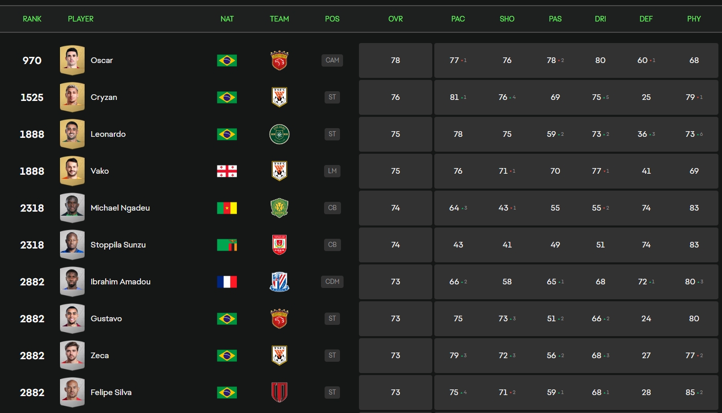 足坛汇9月15日讯 ea官方公布了中超FC25的球员评分,奥斯卡78分居首,前十名全部被外援占据。
