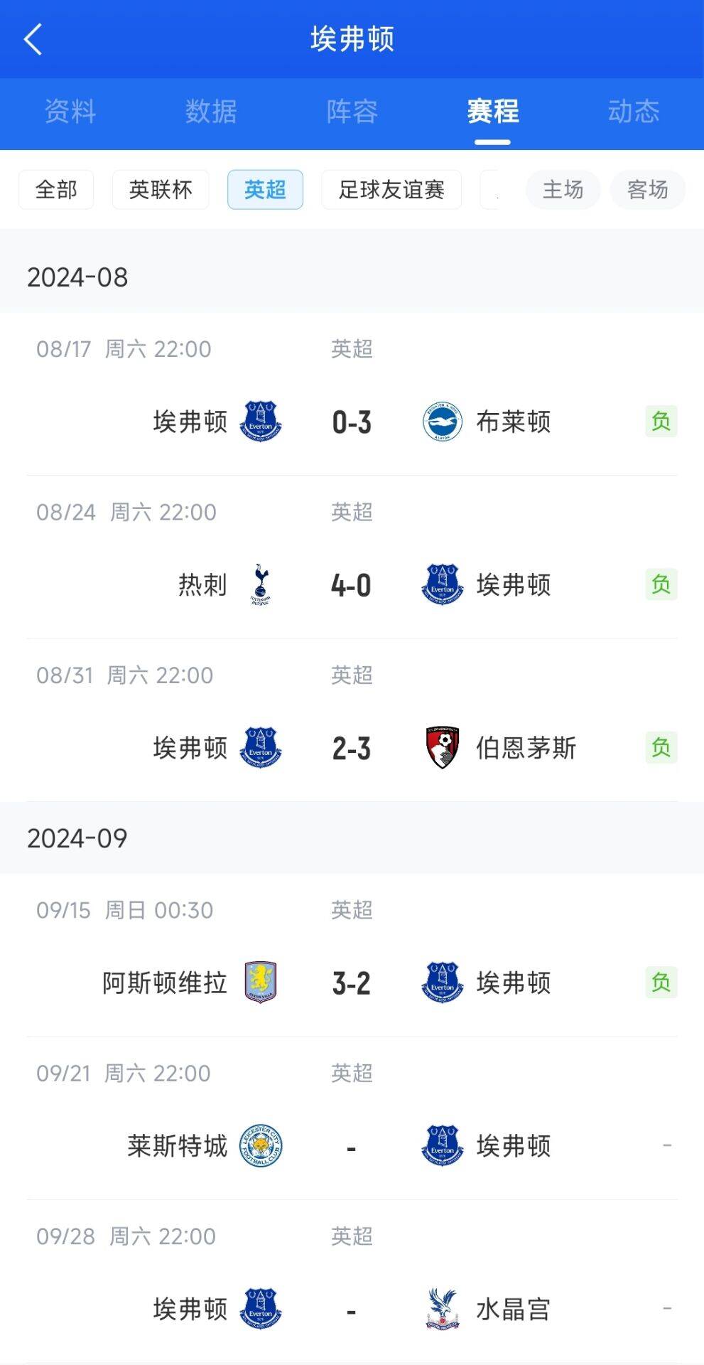 埃弗顿本赛季的开局已经天崩地裂,头两轮一球不进,0-3布莱顿&0-4热刺。近两轮都是2-0领先被让二追三,2-3负伯恩茅斯和阿斯顿维拉。太妃糖场场丢球至少3粒,两次遭大逆转心态难免受影响。