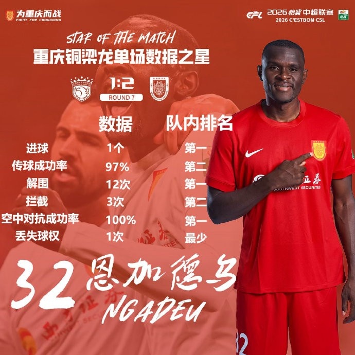 4月23日讯 中超第7轮,重庆铜梁龙战胜上海海港,根据铜梁龙官方信息,恩加德乌当选球队本轮数据之星。