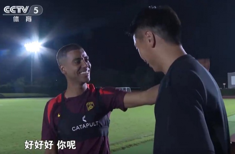 来到国足的训练场,杨旭首先见到的是两名归化球员阿兰和费南多,他直接与阿兰用中文打起了招呼,两人拥抱之后的对白如下: