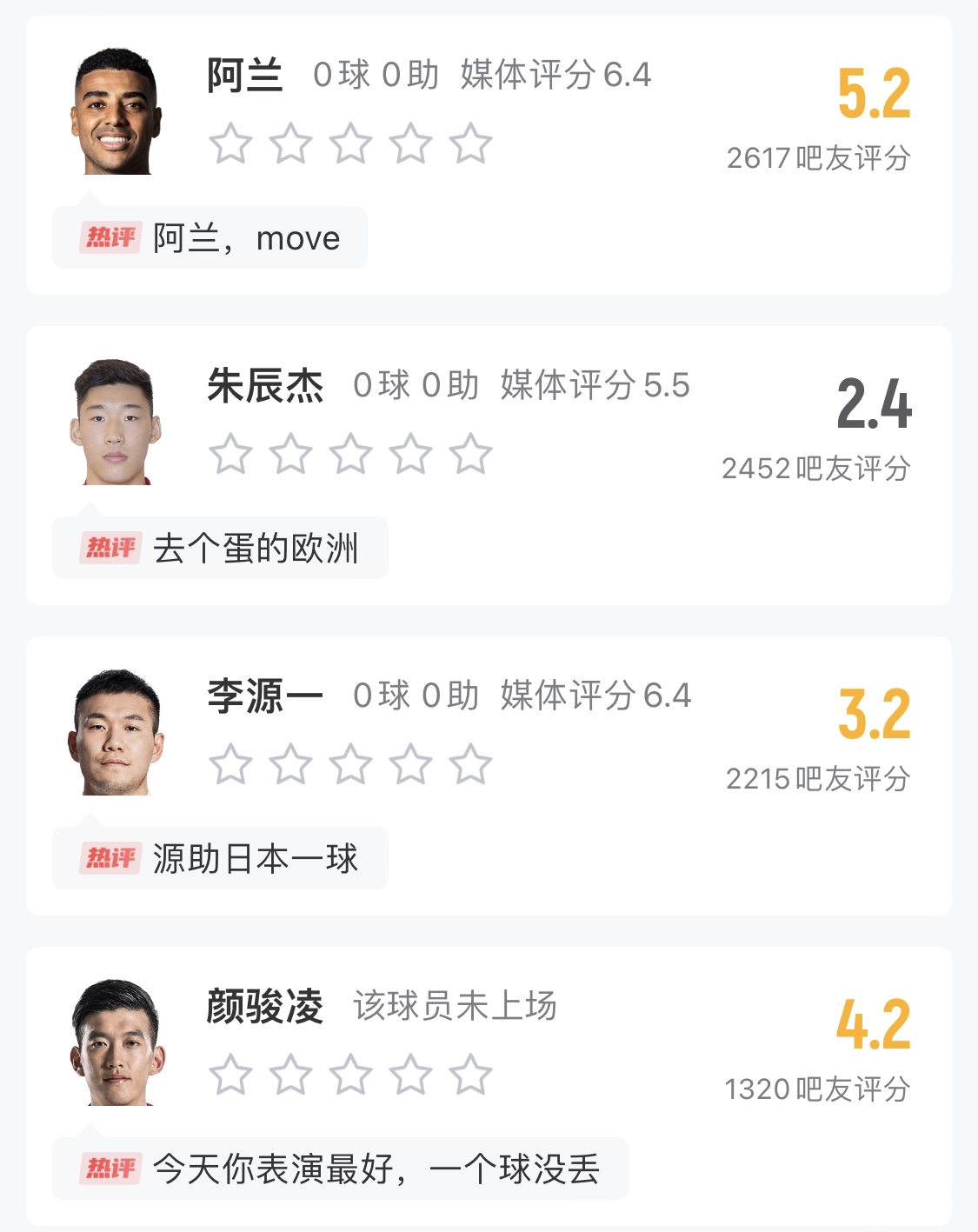 国足18强赛首战客场0-7惨败日本,吧友对国足球员的评分中,王大雷6.4分全队最高分,他和阿兰(5.2分)、费南多(5.2分)是全队仅有的三名评分及格的球员。
