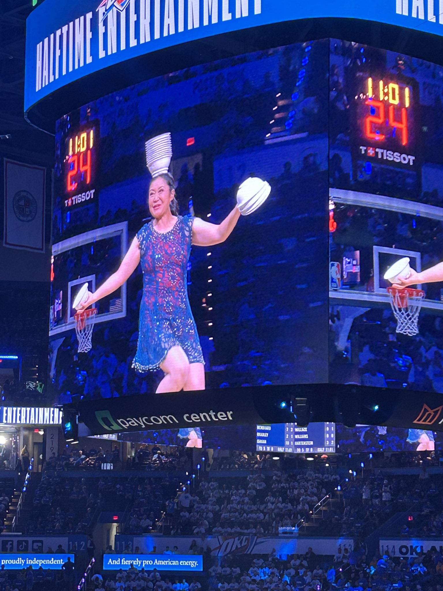 Red Panda,本名牛蓉,从1993年开始为NBA进行中场表演杂技顶碗,至今已经有32年