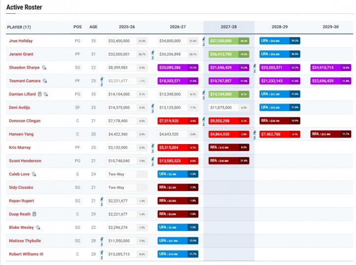 随着夏普和卡马拉两人的续约,开拓者未来阵容已趋于稳定,名单上有8名球员手握至少3年合同:利拉德、霍勒迪、夏普、卡马拉、阿夫迪亚、格兰特、克林根、杨瀚森。
