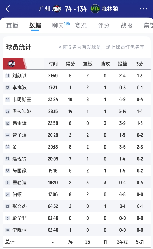 其中刘颜诚4中2拿到5分,管子煜5中1得到2分,逄砚钧4中1得到7分,陈国豪5中1得到6分。