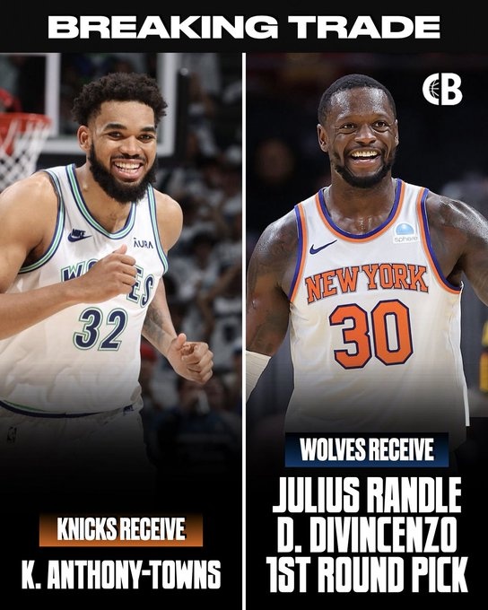 尼克斯将兰德尔、迪文岑佐和一个受保护的首轮签送至森林狼,换来唐斯,此外黄蜂也参与到了这笔交易当中,来帮助尼克斯平衡全队的薪资。