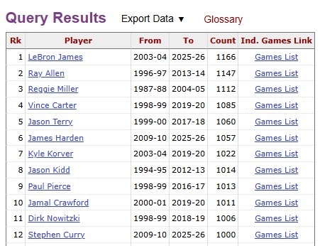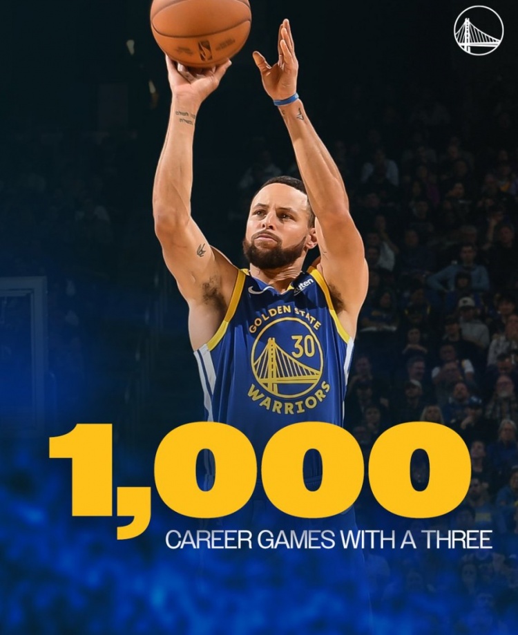 库里1000场比赛有三分入账历史第12人 詹姆斯1166第一哈登第六2025-12-14