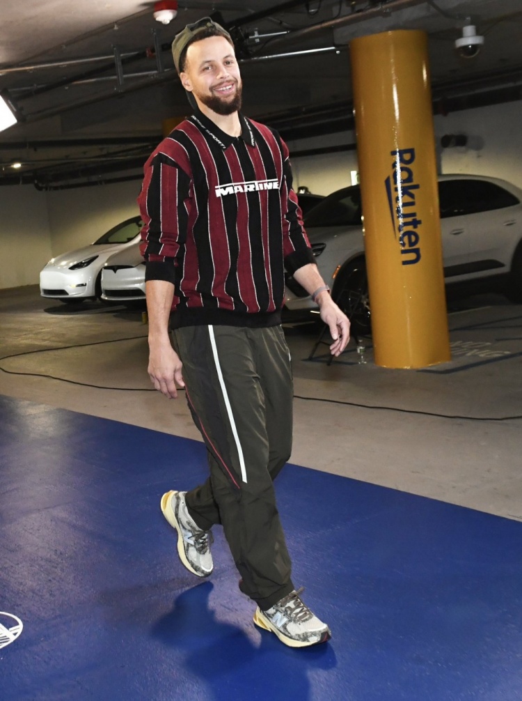 赛前库里入场,他今天穿的是一双Joe Freshgoods x New Balance 2010 款球鞋。