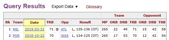本场比赛,开拓者抢下了69个篮板。据统计,推下69+个篮板仍然输掉比赛,开拓者是联盟近7年来的首支球队。2019年3月,雄鹿曾在对阵老鹰时抢下71个篮板输球。