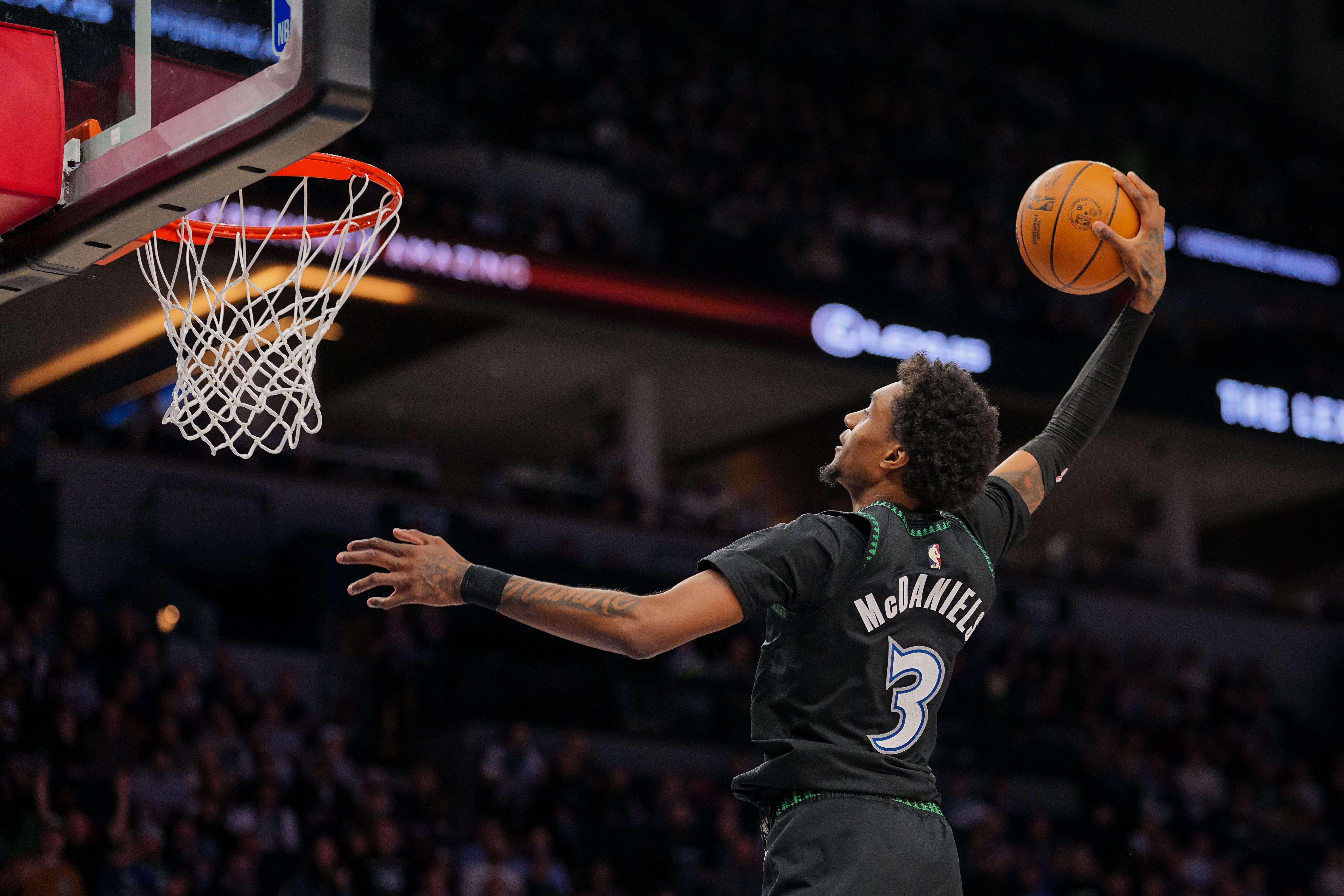 3月23日讯 NBA常规赛,森林狼102-92力克凯尔特人,麦克丹尼尔斯赛后在场边接受了媒体采访。