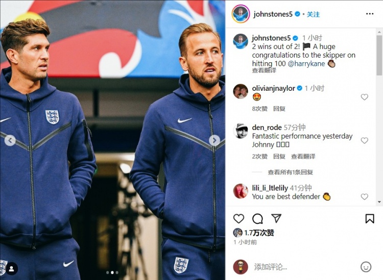 斯通斯写道:“两战全胜!热烈祝贺队长解锁百场里程碑!@哈里-凯恩”