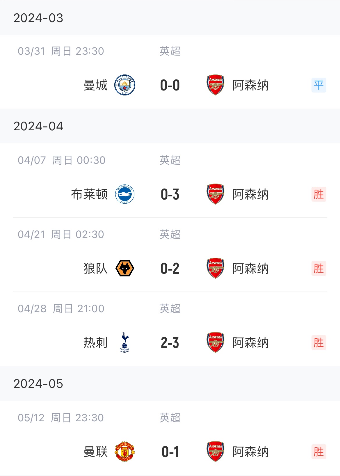 此前,阿森纳已经跨赛季11个英超客场未曾落后,如果下一轮对阵曼城也能做到的话,他们将成为英超历史上第一支连续12个客场不落后的球队。此前阿斯顿维拉在1998年也曾创下11个客场不落后的纪录。