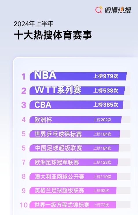 足坛汇09月11日讯 微博热搜公布了2024上半年十大热搜体育赛事,其中欧洲杯第4、中超第5,NBA第1遥遥领先。