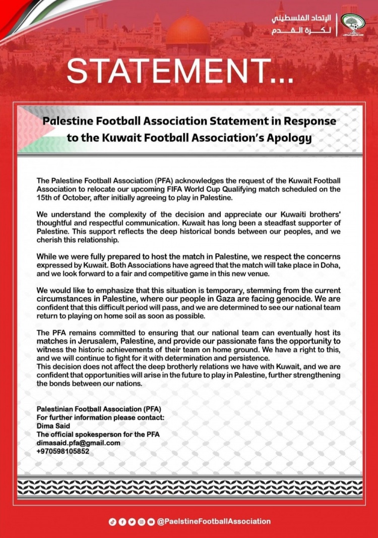 足坛汇9月20日讯 针对球队主场调整一事,巴勒斯坦足协发表声明,向科威特足协致歉。
