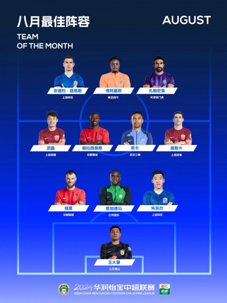 足坛汇9月18日讯 中超官方公布了8月最佳阵容。武磊领衔,奥斯卡、王大雷在列。本次最佳阵容采用3-4-3阵型。最佳阵容名单如下: