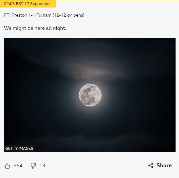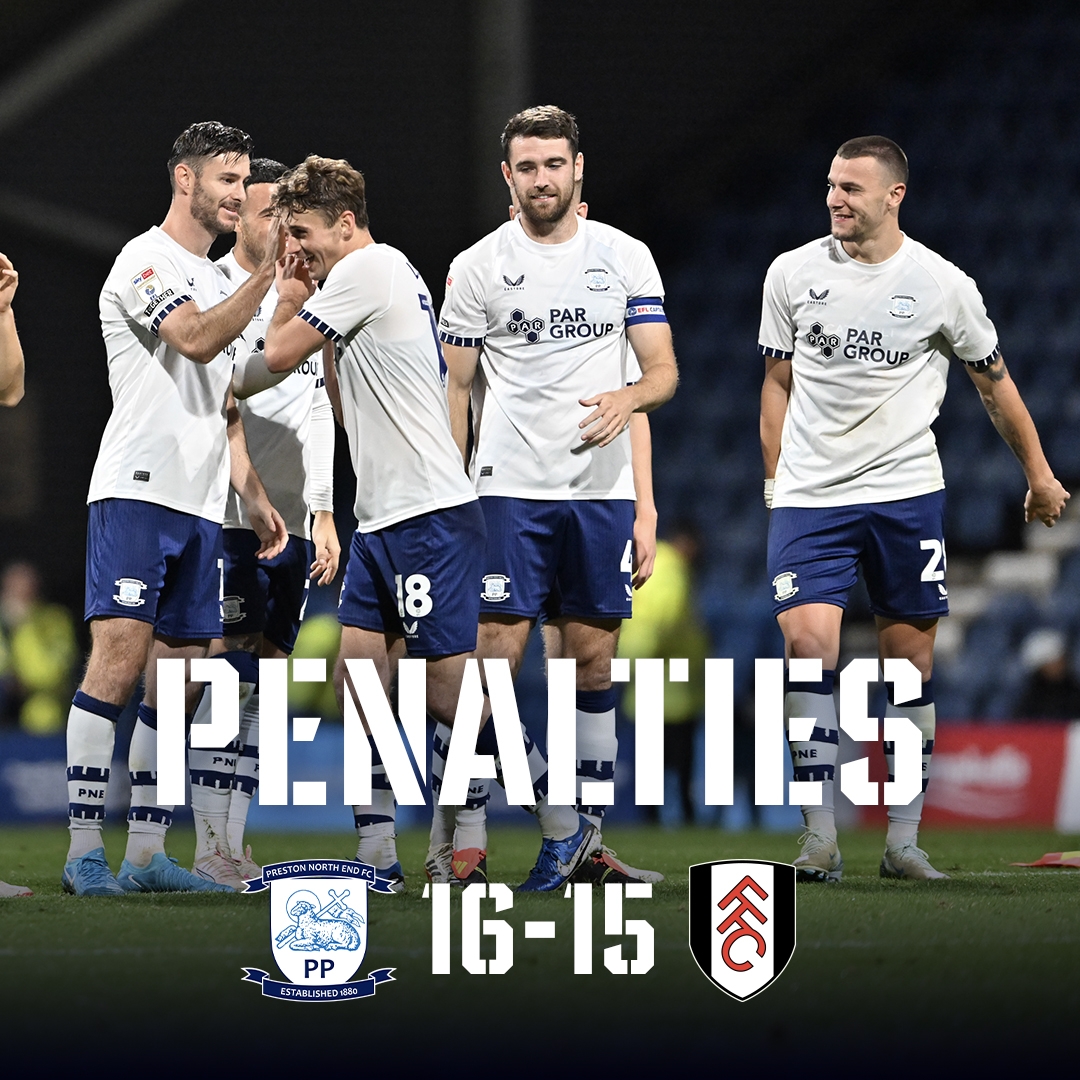 联赛杯第3轮,普雷斯顿vs富勒姆,双方进行了17轮点球大战,普雷斯顿16-15淘汰富勒姆