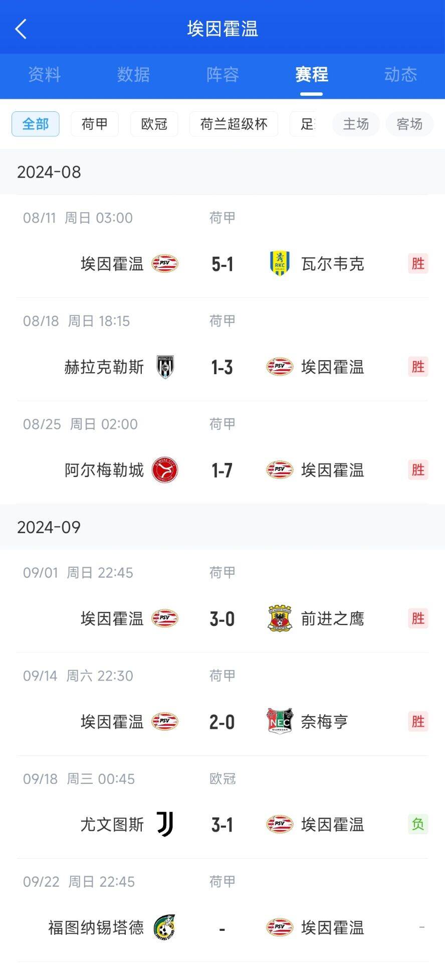 埃因霍温在荷甲可谓是战无不胜,上赛季就91分豪取荷甲冠军。新赛季PSV又是一波5连胜全胜开局,轰20球仅丢3球,场均4球。但是欧战遇到传统豪门尤文图斯,尽管场面不差,球队控球高于尤文,射门13-15&射正5-6,但仍是1-3输球。