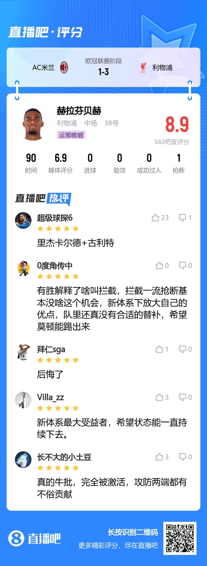 足坛汇09月18日讯 新赛季欧冠首战,利物浦客场3-1逆转米兰取胜,赫拉芬贝赫当选本场最佳,完成7次拦截1次解围。