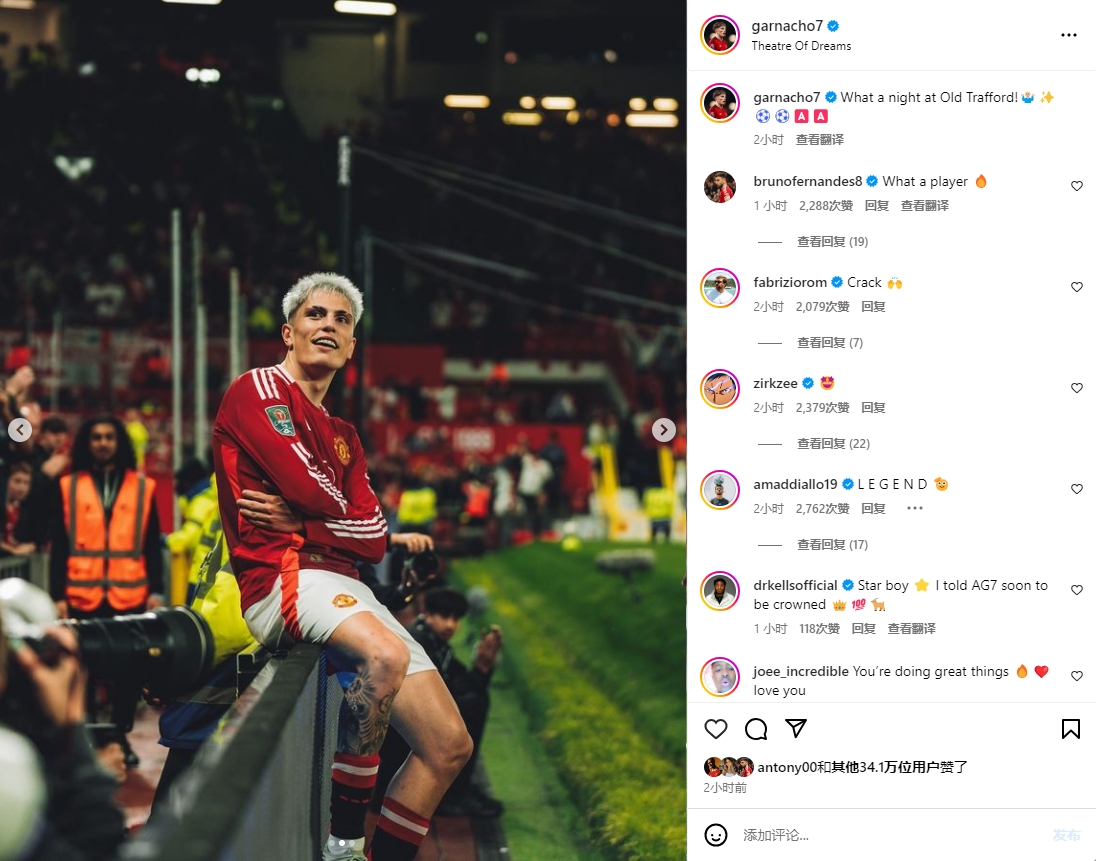加纳乔在社交媒体上晒出自己坐在广告牌上庆祝的照片,并写道:“多么美妙的老特拉福德之夜!两球两助。”