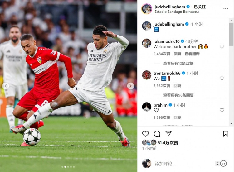 贝林厄姆赛后在社交媒体上晒出比赛照片,并配上“回归”的符号,队友莫德里奇留言:“欢迎回归,兄弟。”