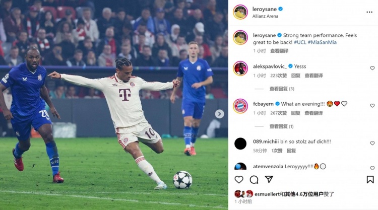 萨内赛后在社媒写道:强劲的表现!欧冠回归的感觉很棒!