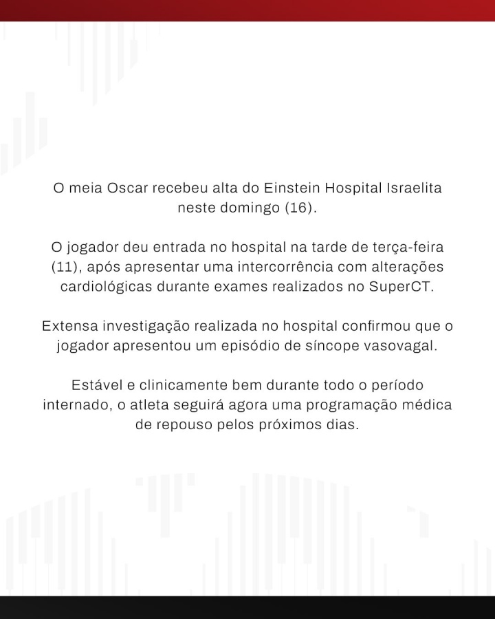11月16日讯 圣保罗官方发布公告,此前体检时晕厥的奥斯卡已经获准出院,目前情况良好。