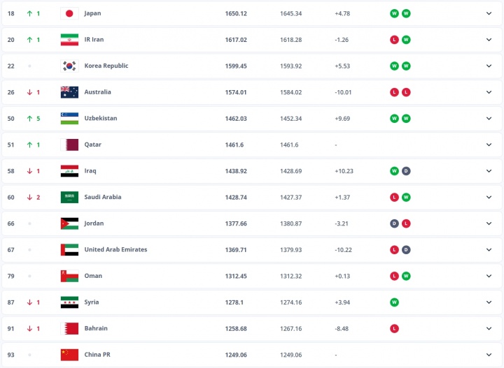 11月19日讯 国际足联最新一期世界排名出炉,中国队排名仍居世界第93,亚洲第14。