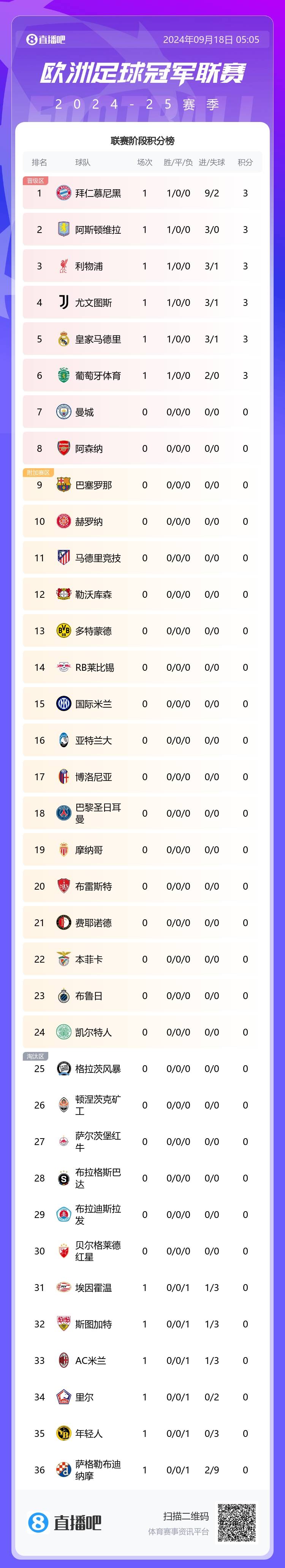 全新欧冠来袭!改制后的第一份积分榜出炉啦!目前是首轮狂胜的拜仁排在榜首。