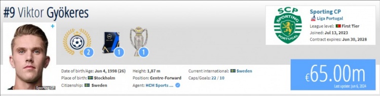 本赛季至今,约克雷斯在俱乐部7场比赛贡献9球3助,国家队比赛2场3球2助,目前他的德转身价已直奔6500万欧元。