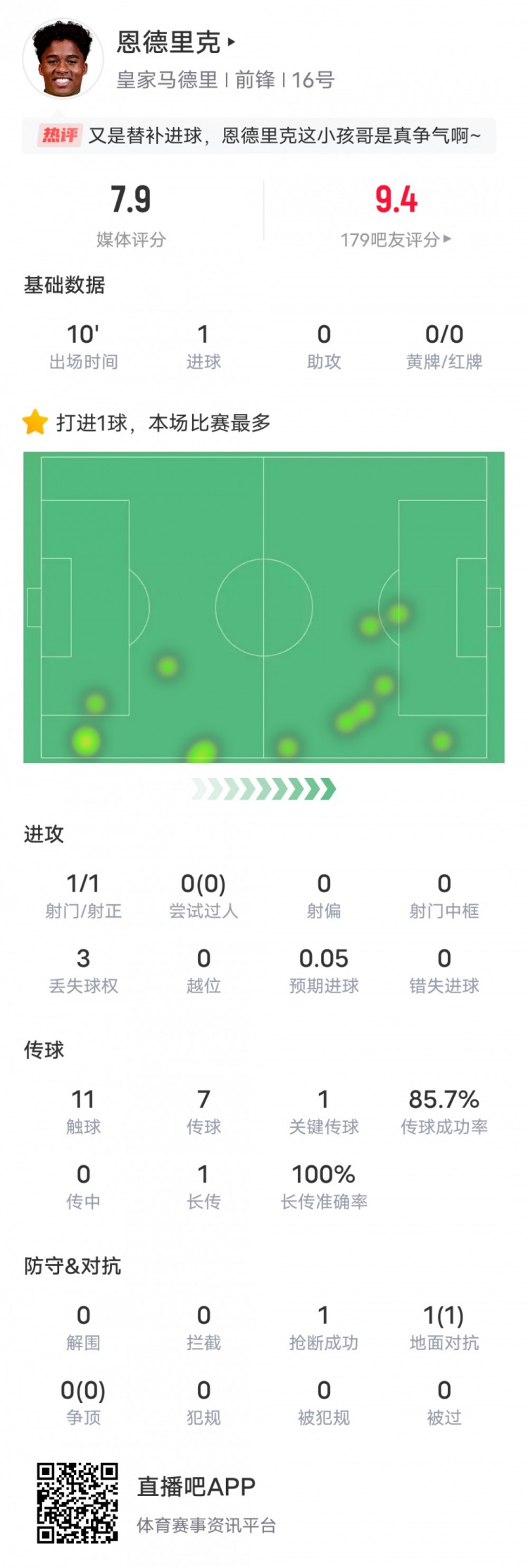 足坛汇9月18日讯 在今日凌晨进行的欧冠联赛阶段第一轮的一场较量中,皇马3-1斯图加特。恩德里克替补建功,他还送出1次关键传球,评分7.9。