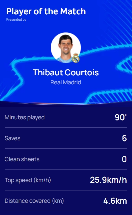 本场比赛,库尔图瓦发挥出色,贡献6次扑救。