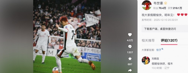 12月11日讯 在结束2025赛季所有比赛后,成都蓉城球员韦世豪更新个人社交媒体,祝大家假期愉快,明年见!