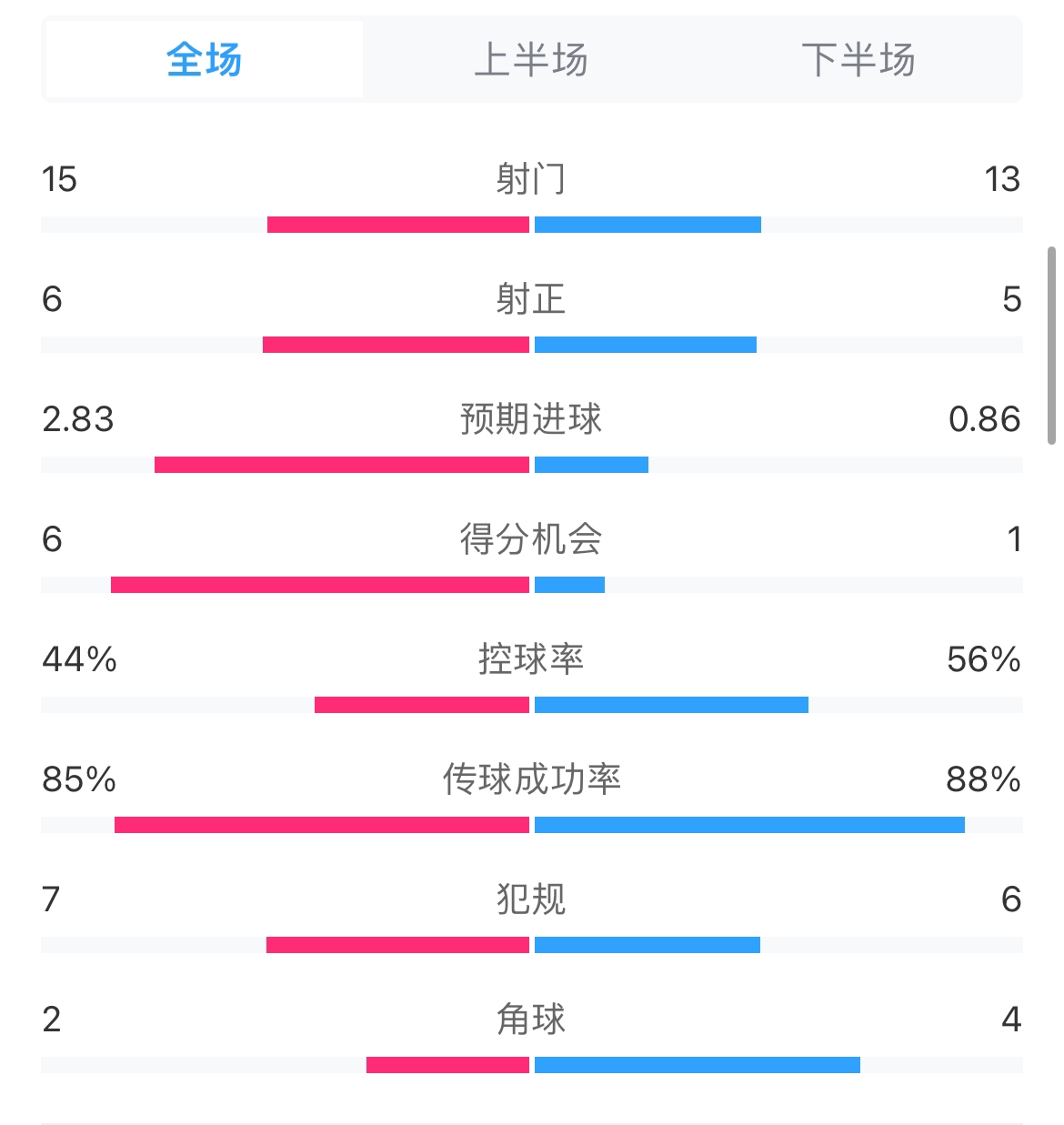 尤文全场15射6正,埃因霍温13射5正,控球率44%-56%。