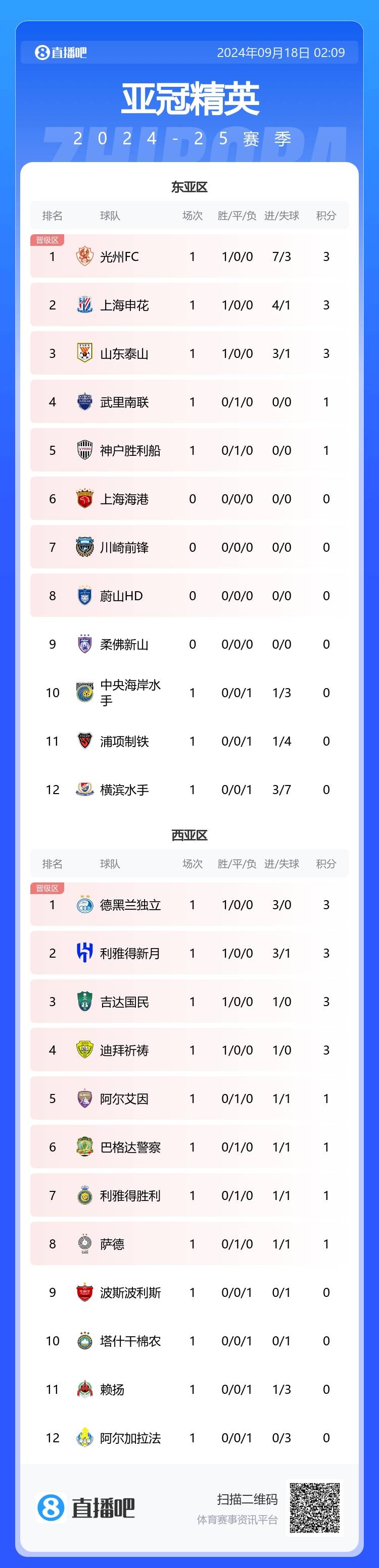 亚冠精英联赛积分榜如下↓