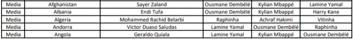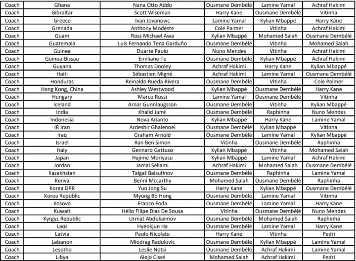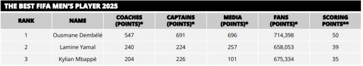 12月17日讯 FIFA年度颁奖典礼结束,登贝莱最终当选年度最佳球员(世界足球先生)。FIFA官网公布的投票详情如下,全世界的主帅+队长+媒体代表选出了他们认为的最佳球员前三名。