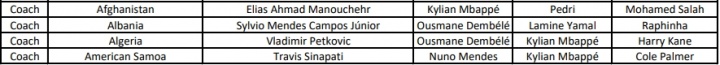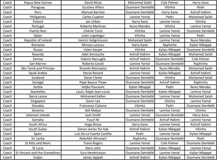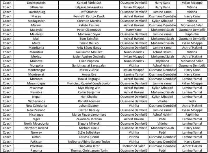 主帅投票详情:(文字顺序:国家/地区 投票人 1选 2选 3选)