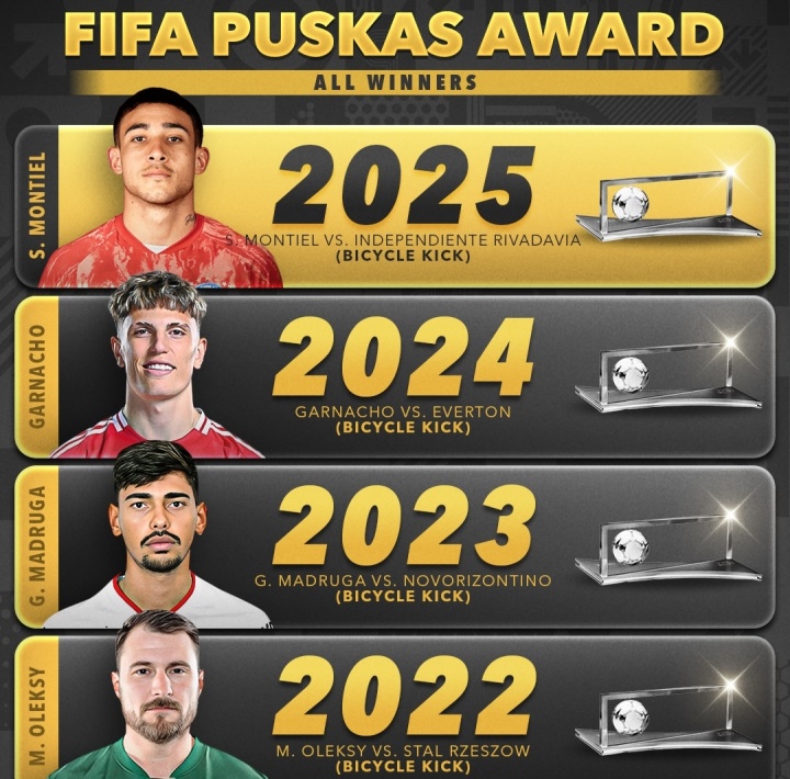 哪球最佳近4届普斯卡什都是倒勾:蒙铁尔新科得主 去年加纳乔2025-12-17