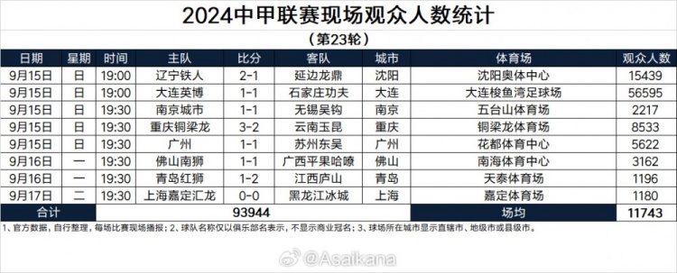 2024中甲联赛现场观众人数统计(第23轮)