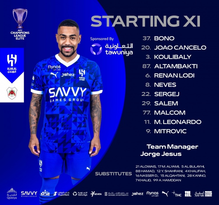 利雅得新月此役首发:37-布努、20-坎塞洛、3-库利巴利、87-坦巴克蒂、6-雷南-洛迪、8-鲁本-内维斯、22-米林科维奇、29-多萨里、77-马尔科姆、11-莱昂纳多、9-米特洛维奇